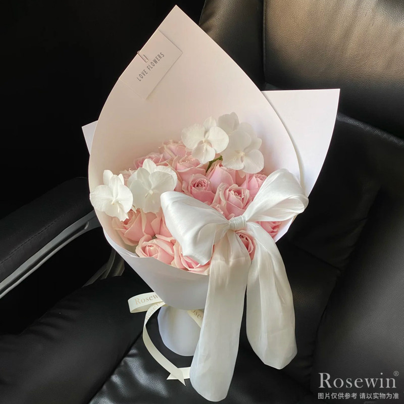 19朵粉玫瑰,白色蝴蝶蘭、緞帶裝飾